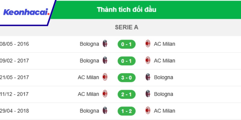Lịch sử chạm trán giữa AC Milan và Bologna
