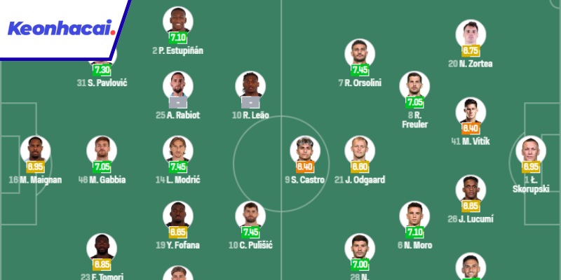 Cầu thủ ra sân | Maignan, Pavlović, Gabbia, Tomori, Estupiñán, Rabiot, Modrić, Fofana, Saelemaekers, Leão, Pulisic | Skorupski, Zortea, Vítik, Lucumí, Lykogiannis, Freuler, Moro, Orsolini, Odgaard, Cambiaghi, Castro |