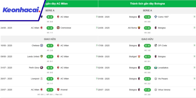 Phong độ gần đây của từng đội AC Milan và Bologna