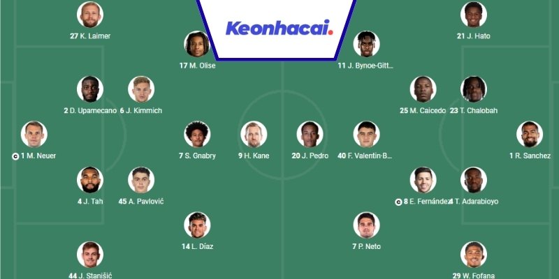 Cầu thủ ra sânNeuer, Laimer, Upamecano, Kimmich, Gnabry, Olise, Kane, Pavlović, Tah, Stanišić, DíazSanchez, Chalobah, Fofana, Adarabioyo, Caicedo, Fernández, Pedro, Valentin-Bassi, Hato, Bynoe-Gittens, Kane