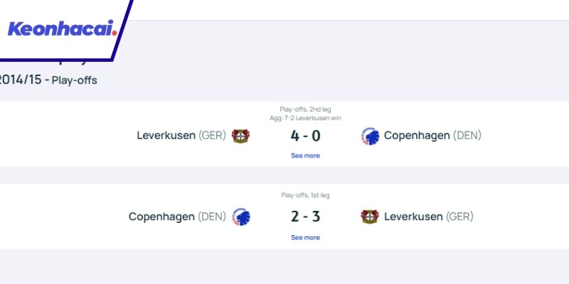 Nhìn lại những lần đối đầu gần nhất, có thể thấy sự vượt trội của đội bóng Đức trong các cuộc đối đầu. Trong hai trận đấu vào tháng 8 năm 2014, Leverkusen dễ dàng đánh bại Copenhagen với tỷ số 3-2 ở lượt đi và thắng đậm 4-0 khi đá trên sân nhà. Điều này thể hiện sự “trên cơ” rõ rệt về sức mạnh đội hình của đội bóng Đức.