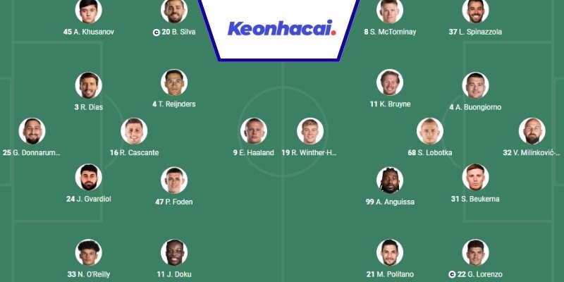 Cầu thủ ra sânDonnarumma, Gvardiol, Reijnders, Dias, Lewis, Khusanov, Rodri, Silva, Foden, Doku, HaalandMeret, Di Lorenzo, Beukema, Anguissa, Lobotka, Buongiorno, McTominay, K. De Bruyne, Politano, Højlund, Spinazzola