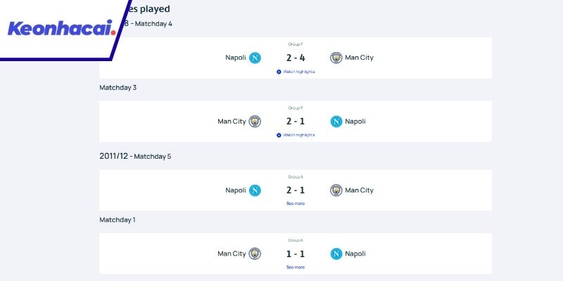 Trong 4 lần gặp nhau, Man City luôn là đội nắm ưu thế, đặc biệt là khi họ giành chiến thắng 4-2 ngay tại sân San Paolo và 2-1 trên sân nhà Etihad. Những chiến thắng này phản ánh rõ sự vượt trội về mặt lực lượng và lối chơi tấn công của đội bóng áo xanh dưới thời Pep Guardiola.