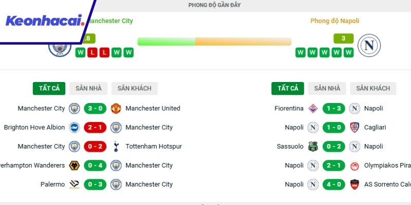 Phong độ gần đây của từng đội Man City và Napoli